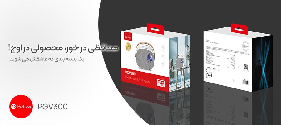 هنگامی که برای خرید ویدئو پروژکتور پرووان مدل PGV300 به فروشگاه های مربوطه مراجعه می کنید، پیش از هر چیز با بسته بندی جذاب و خیره کننده این محصول مواجه خواهید شد. جعبه پروژکتور PGV300 با طراحی ساده و در عین حال شیک، حس یک محصول باکیفیت را به شما القا می کند. رنگ سفید و لوگوی برجسته پرووان در کنار تصویری از خود پروژکتور بر روی جعبه، به زیبایی در کنار هم قرار گرفته و هارمونی جذابی را ایجاد کرده اند. جعبه این محصول از کارتن مقوایی ضخیم ساخته شده و به خوبی از پروژکتور و متعلقات آن دربرابر ضربه و آسیب محافظت می کند. داخل جعبه نیز با فوم های مخصوص پوشیده شده است که به طور کامل پروژکتور را در برمی گیرد و از تکان خوردن و خط وخش افتادن روی آن در حین حمل ونقل جلوگیری می کند. در اطراف بسته بندی ویدئو پروژکتور قابل حمل پرووان مدل ProOne PGV300 نیز اطلاعات مهمی درباره محصول ازجمله مشخصات فنی، قابلیت ها، نوع اتصال و همچنین محتوای داخل جعبه به طور واضح و خوانا درج شده است. این اطلاعات به شما کمک می کند تا قبل از بازکردن جعبه، نسبت به مشخصات کلی محصول آگاه شوید و به این ترتیب، خرید مطمئن تری را تجربه کنید.